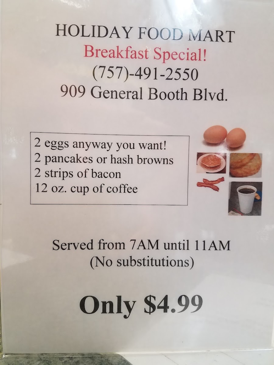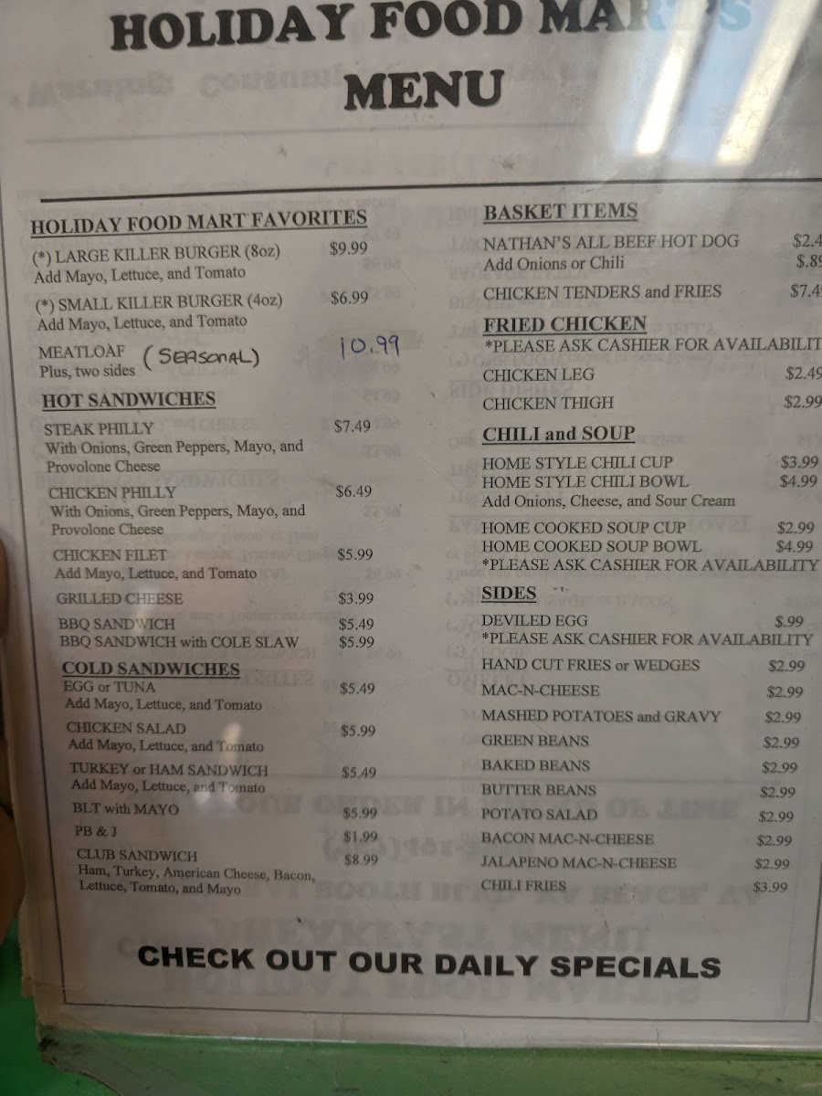 At Holiday Food Mart, you’ll find a menu that captures the vibrant flavors and comfort of home-cooked meals, all served with a dash of convenience. Nestled at 909 General Booth Blvd in Virginia Beach, this spot is your go-to for quick yet satisfying bites. The Holiday Food Mart Menu features a wide range of delicious options, from hearty sandwiches to fresh salads, each crafted to bring you a taste of something familiar and delicious. Whether you're grabbing a snack on the go or sitting down for a casual meal, there’s always something to please your taste buds. It’s not just about food here-it’s about enjoying great meals made with quality ingredients, all served in a relaxed atmosphere.
